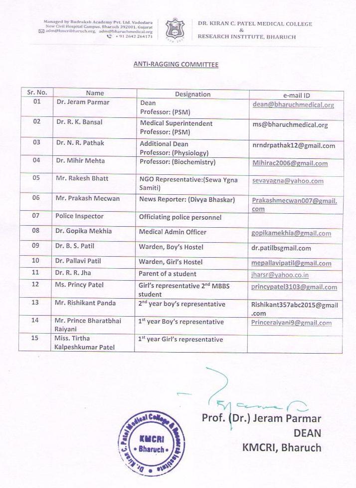 - At the end of every academic year a letter will be sent to the parents/guardians of the students who are completing the first year informing them about the law regarding ragging and the punishments, and appealing to them to impress upon their wards to desist from indulging in ragging when they come back at the beginning of the next academic session.